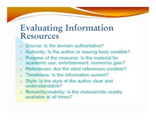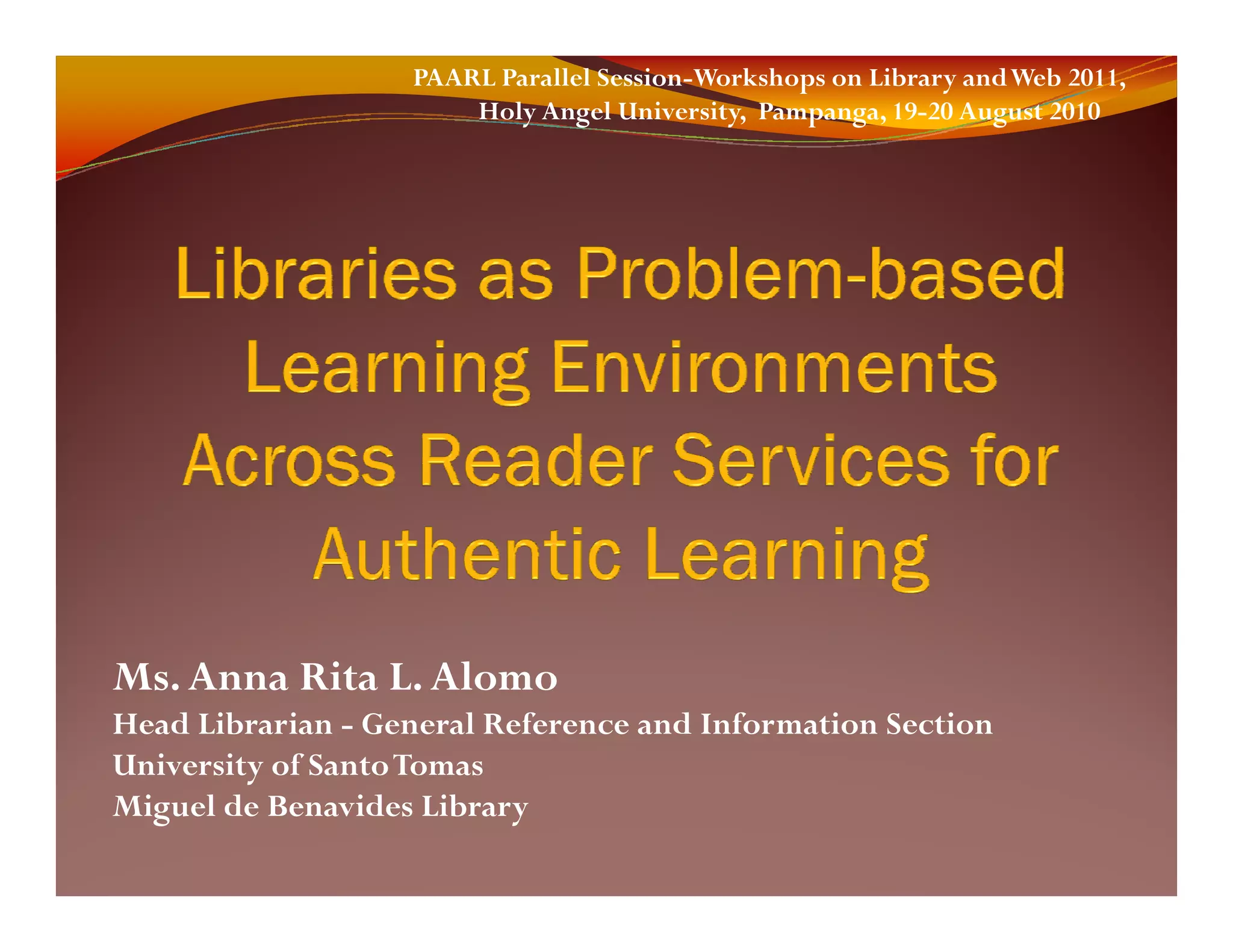 The document discusses problem-based learning (PBL) and the role of librarians in supporting PBL programs. It defines PBL as an instructional method that relies on collaboration, critical thinking, and hands-on learning. The document outlines six frameworks for librarian involvement in PBL including reference desk assistance, instruction, course-related support, collection management, faculty/student consultation, and group facilitation. It also discusses authentic learning approaches and their importance in developing real-world problem solving skills through activities like case studies and simulations.