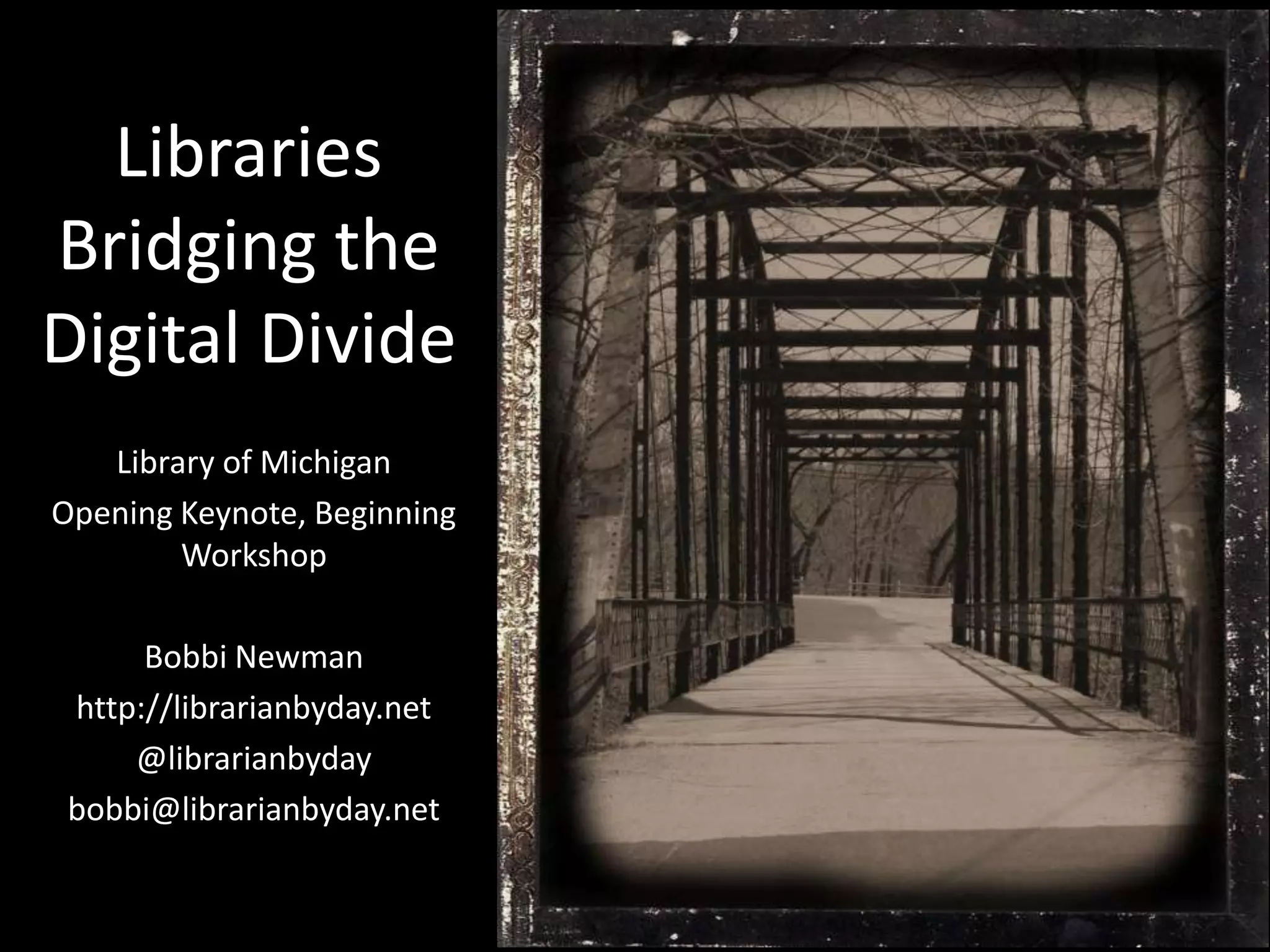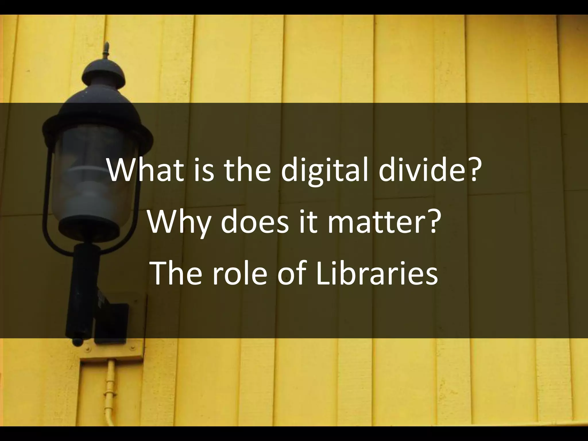 The digital divide refers to the gap between those who have access to digital technologies and the internet versus those who do not. Approximately one third of Americans, or 100 million people, lack access largely due to socioeconomic factors. Libraries play a key role in bridging this divide by providing free internet access and digital literacy training to 77 million Americans annually, serving as the sole provider of these services in 64.5% of communities. Increasing access and skills is important as internet access impacts opportunities in education, employment, civic participation and more.