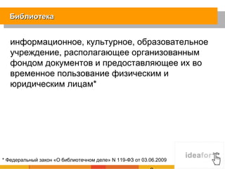 Документ рассматривает роль библиотек в цифровую эпоху, акцентируя внимание на их трансформации из традиционных хранилищ знаний в открытые пространства для социального вовлечения и доступа к цифровым ресурсам. Он подчеркивает кризисные явления, вызванные массовым переходом к цифровым форматам информации и ростом конкуренции со стороны интернет-ресурсов. Акцентируется необходимость библиотек адаптироваться, предлагая уникальные услуги, которые иначе невозможно получить.