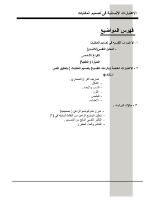 اﻻﻧﺳﺎﻧﯾﺔ اﻻﻋﺗﺑﺎرات اﻟﻣواﺿﯾﻊ ﻓﮭرس ١-اﻟﻣﻛﺗﺑﺎت ﺗﺻﻣﯾم ﻓﻲ اﻟﻧﻔﺳﯾﮫ اﻻﻋﺗﺑﺎرات -اﻟﻧﻔﺳﻲ اﻟﺗﺣﻠﯾل)ﻟﻼﻧﺳﺎن( اﻟﺷﺧﺻﻰ اﻟﻔراغ اﻟﺣﯾﺎزة)اﻟﻣﻠﻛﯾﺔ( ٢-اﻟﺧﺎﺻﺔ اﻻﻋﺗﺑﺎرات)اﻟﻧﻔﺳﯾﮫ ﺑﺎﻟراﺣﮫ(اﻟﻣﻛﺗﺑﺎت ﺑﺗﺻﻣﯾم)اﻗﺻﻰ ﺑﺗﺣﻘﯾق اﺳﺗﻔﺎده:( اﻟﻣﻌﻣﺎري اﻟﻔراغ ﺗﻌﺎرﯾف. -اﻟﺷﻛل. -واﻻﺑﻌﺎد اﻟﻧﺳب. -اﻟﻠون. -اﻟﻣﻠﻣس. -اﻻﺿﺎءه. ٣-اﻟدراﺳﮫ ﺣﺎﻻت: -اﻟراھن ﻟﻠوﺿﻊ ﻋﺎم ﺷرح).ﺗﺻﻣﯾﻣﯾﺎ( -ﻓﻲ اﻟﺳﺎﺑﻘﮫ اﻟﻧﻘﺎط ﻣن اﻟراھن اﻟوﺿﻊ ﺗﺣﻠﯾل)٢( -اﻟﺗﺻﻣﯾم ﻣن اﻟﻧﺎﺗﺞ اﻟﻧﻔﺳﻲ اﻟﺗﺄﺛﯾر. -اﻟﻣﻘﺗرح واﻟﺣل اﻟﻧﺗﺎﺋﺞ.