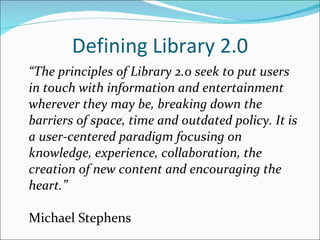Library 2.0 aims to put users at the center by breaking down barriers and encouraging collaboration and new content creation. It emphasizes constant evaluation and purposeful change driven by user feedback, practicing constant learning, and blending social and academic functions. Access services staff have an essential role to play in evaluating services, implementing changes, and helping the library adopt a Library 2.0 model.