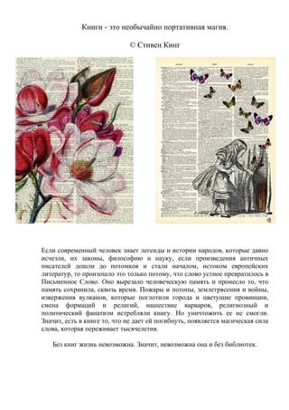 В документе представлена творческая работа 15-летней читательницы, описывающая ее любовь к библиотекам и важность книг в жизни человека. Она делится своими воспоминаниями о библиотеке, акцентируя внимание на магической силе слова и уникальной атмосфере, которую создают настоящие библиотеки. Автор подчеркивает, что несмотря на современные технологии, традиционные библиотеки остаются необходимыми для сохранения культуры и духовного развития.