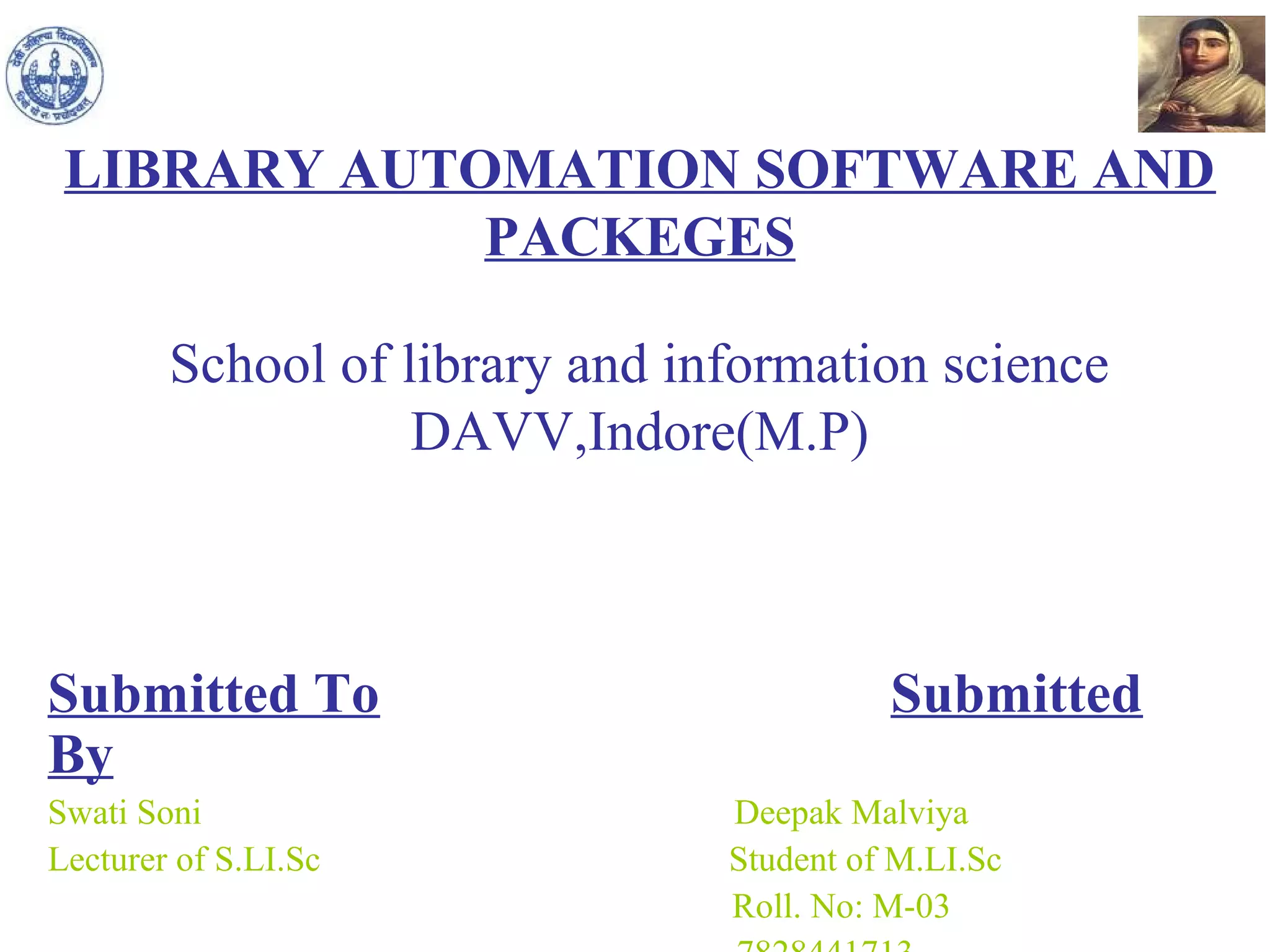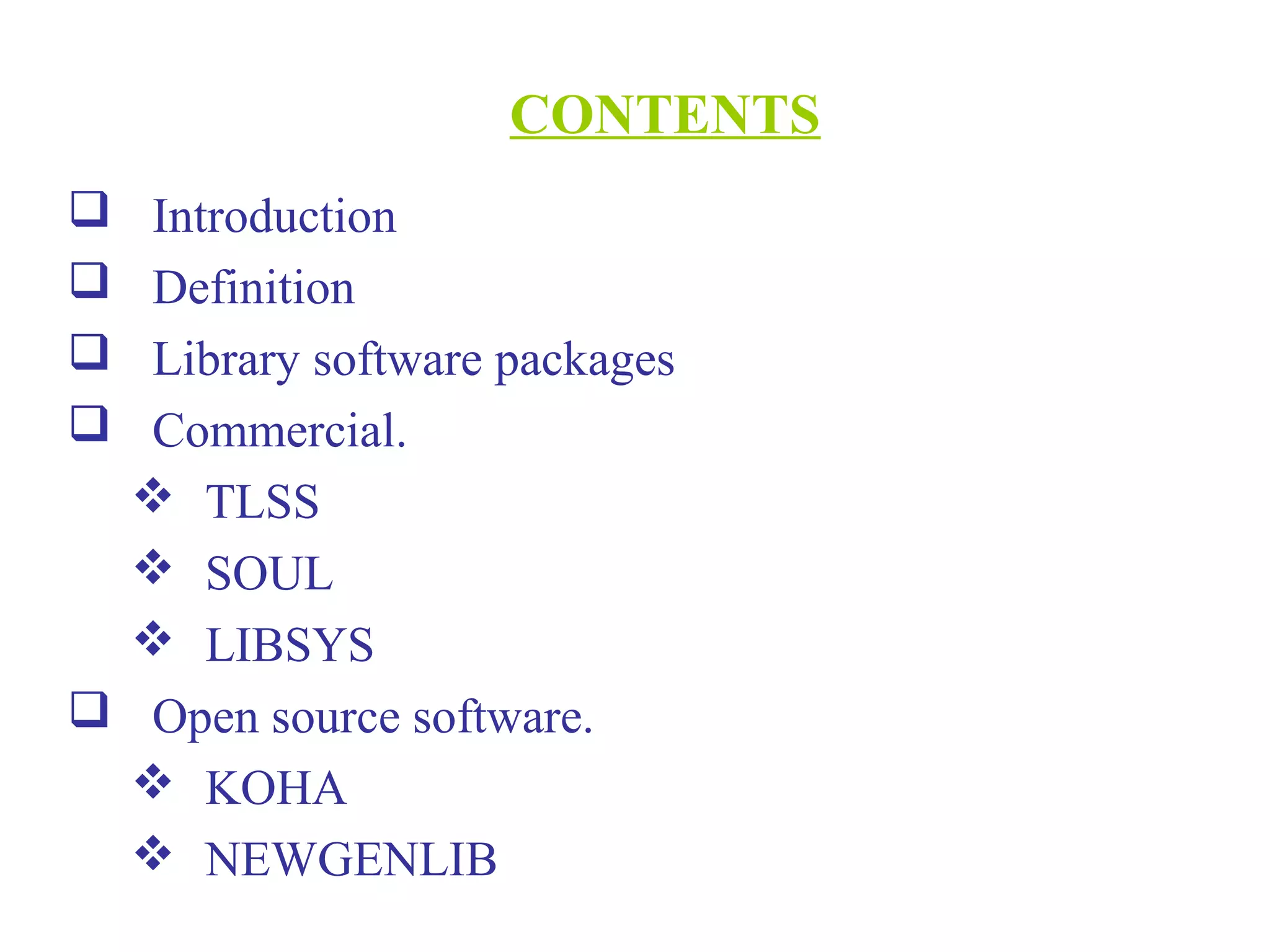 This document discusses and compares various library automation software packages, including both commercial and open source options. It provides descriptions of popular commercial software like TLSS, SOUL, and LIBSYS, as well as open source options such as Koha and Newgenlib. The document outlines the features and modules included in each program. In conclusion, it states that while no single software is best for all libraries, automation is now essential and open source options provide flexibility.