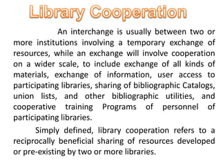 Library cooperation refers to the sharing of resources between two or more libraries. It allows for a more comprehensive collection, avoids duplication, and reduces costs. Areas of cooperation include inter-library loans, cooperative acquisitions, cataloging, and more. Barriers to cooperation include inadequate funding, outdated technology, lack of standards, and reluctance to participate. However, the future of library cooperation involves sharing expertise and people to take advantage of current opportunities for sharing resources.