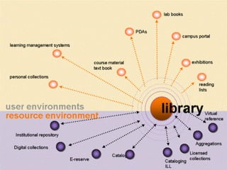 The document discusses different types of library environments including traditional print-based libraries, hybrid libraries with both print and digital resources, and fully digital libraries, and emphasizes that a library should provide a conducive environment for users to access resources and for materials to be stored through factors like location, lighting, temperature control, and necessary equipment and services.