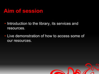This document provides an introduction to the library services and resources available to Middlesex University students. It outlines key services like accessing electronic resources, support for distance learners, and help resources. Live demonstrations will show how to use resources like the library catalog, Summon discovery tool, databases, and subject guides. Expert librarians are available to help students find and use information for their studies.