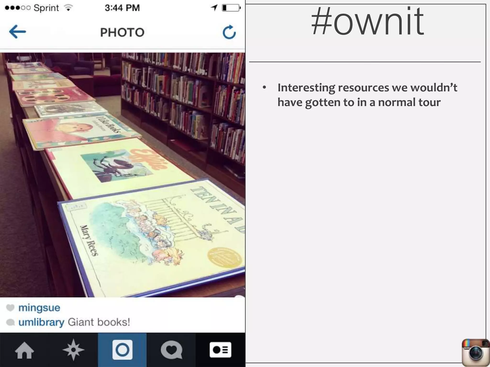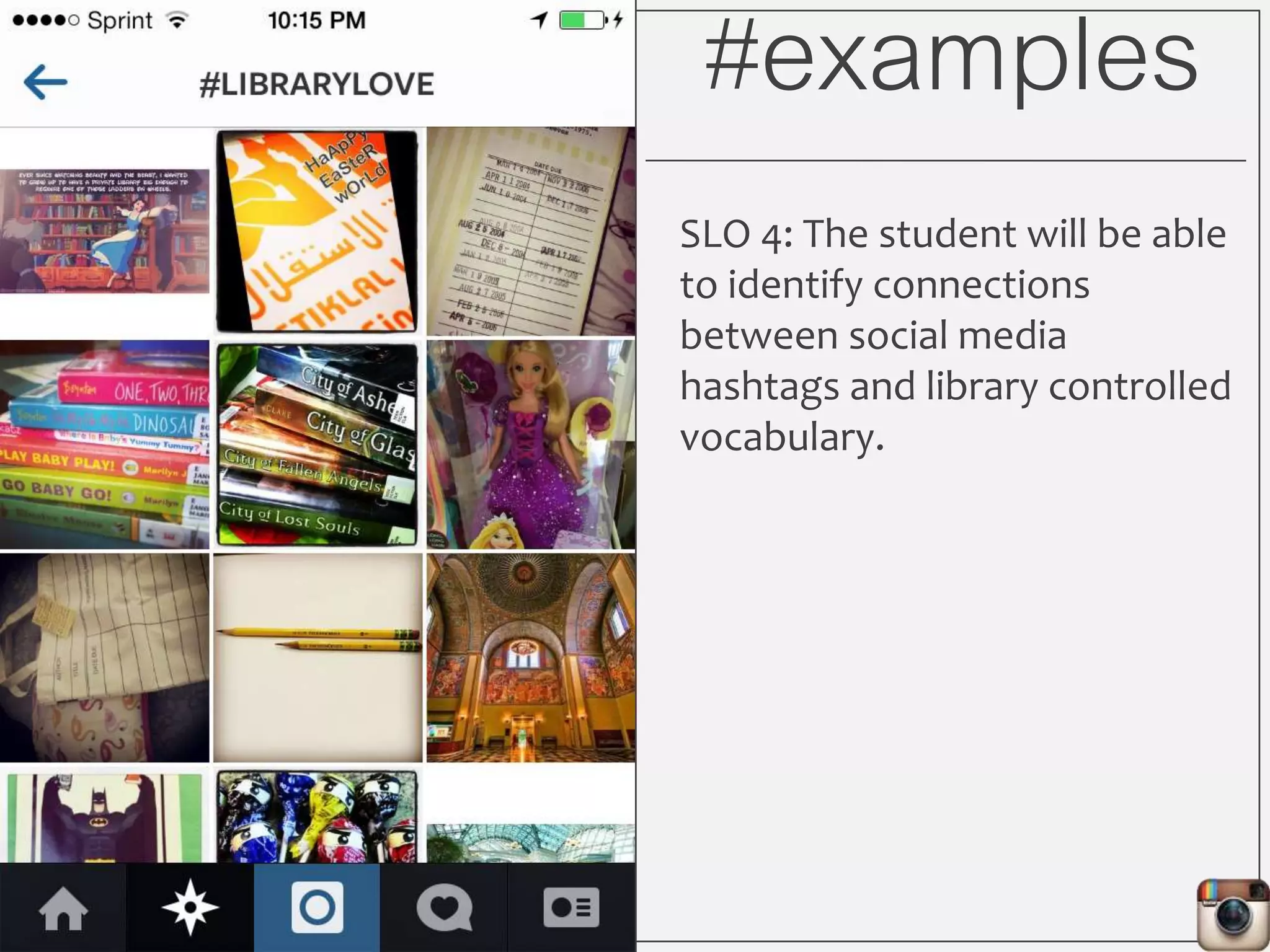 This document outlines Lauren Wallis' presentation on using Instagram for library instruction. She describes how she developed an Instagram library tour for freshman English students to make the experience fun, social, and student-guided. Wallis discusses the concepts of library anxiety, active learning, critical pedagogy, and metaliteracy that informed the project. She provides examples of student posts that addressed the learning outcomes and assessments that showed what students learned and still had questions about.