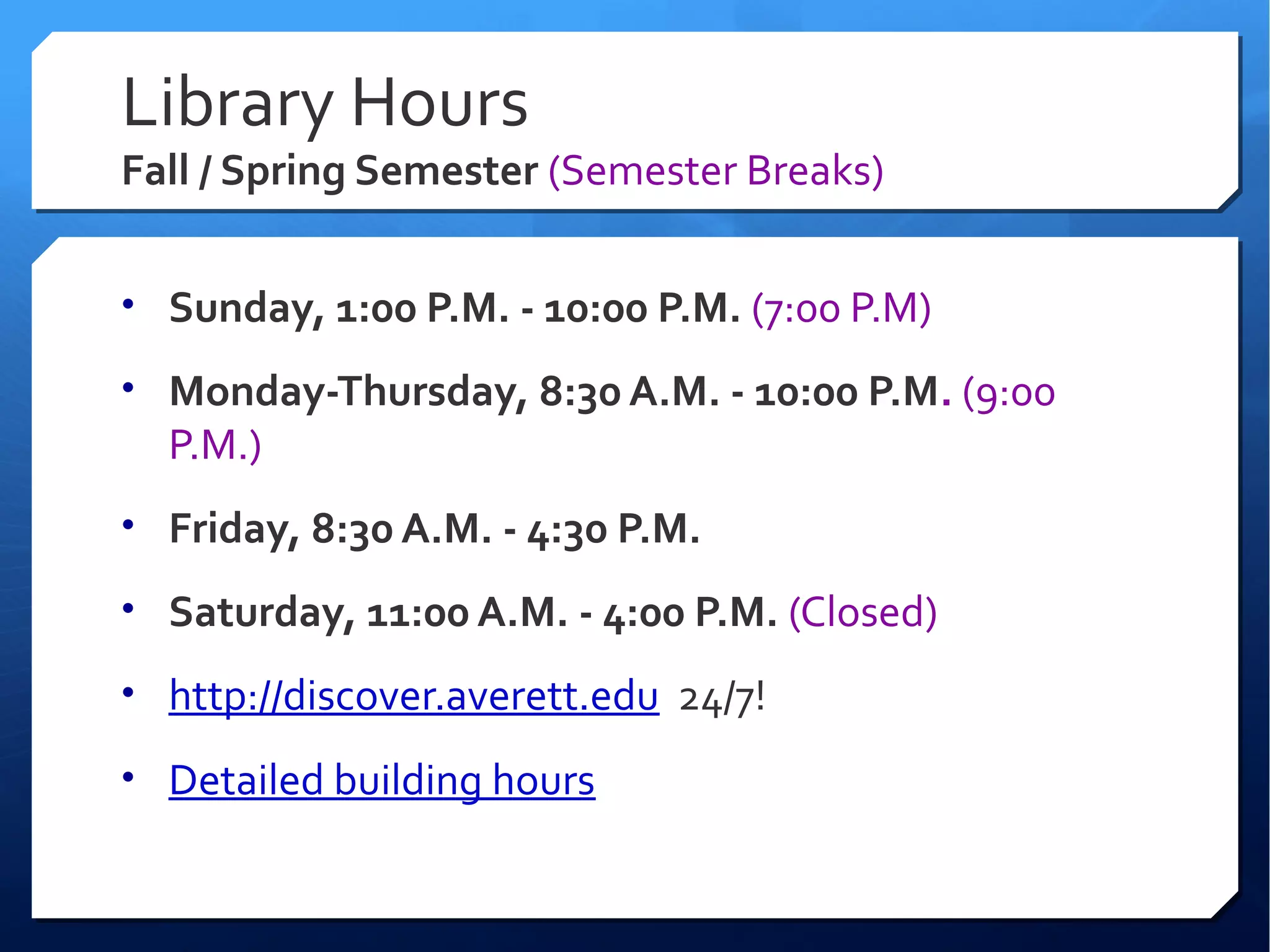 The Mary B. Blount Library at Averett University provides resources and services to students, faculty and staff. It has over 100,000 print books and ebooks, as well as research databases and special collections. Library hours vary by day of the week, and online access to digital resources is available 24/7. Borrowing policies apply to AU items, and interlibrary loan is available for other materials. In 2011-12, the library had over 27,000 visits and answered thousands of reference questions. It offers library instruction sessions and weekly Coffee Talk presentations on research topics.