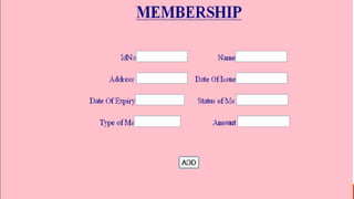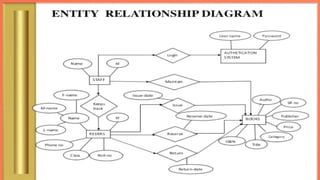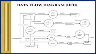 The document outlines the scope and design of a library management system. It includes sections on project purpose, scope, assumptions, functionality, specific requirements, tools/platform, resources used, design specification including entity relationship and data flow diagrams, database structure, module description, process logic, types of reports, and future scope. The system is intended to automate processes like membership registration, book issuing/returning, tracking book inventory and member records. It will leverage ASP.NET and SQL Server for development.