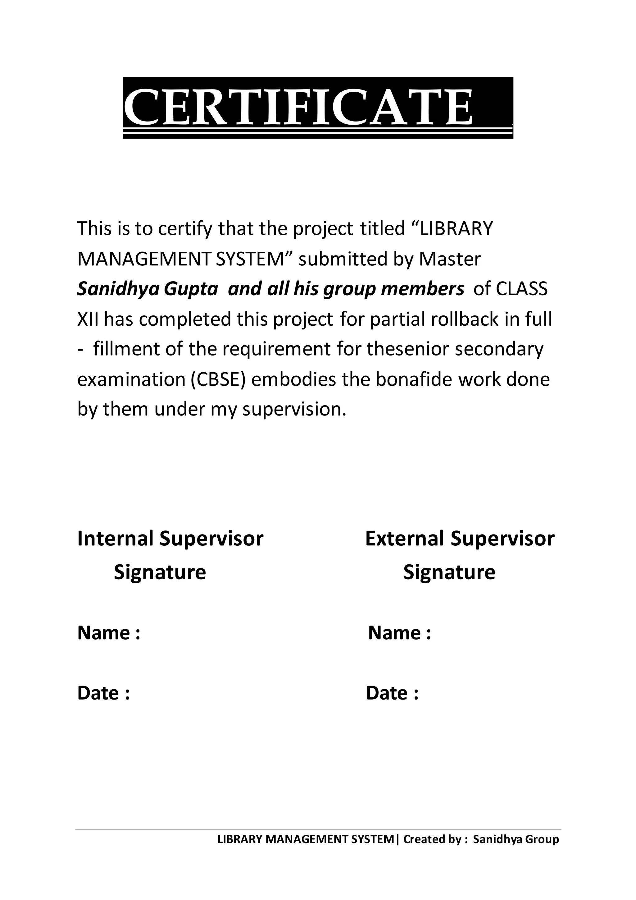 The document outlines a group project titled 'Library Management System' created by Sanidhya Gupta and his team for their senior secondary examination. It includes details about the project's objectives, design, implementation using Java and MySQL, and acknowledges their teacher's support. Key sections cover Java features, database connectivity using JDBC, and user interface designs for managing library transactions.
