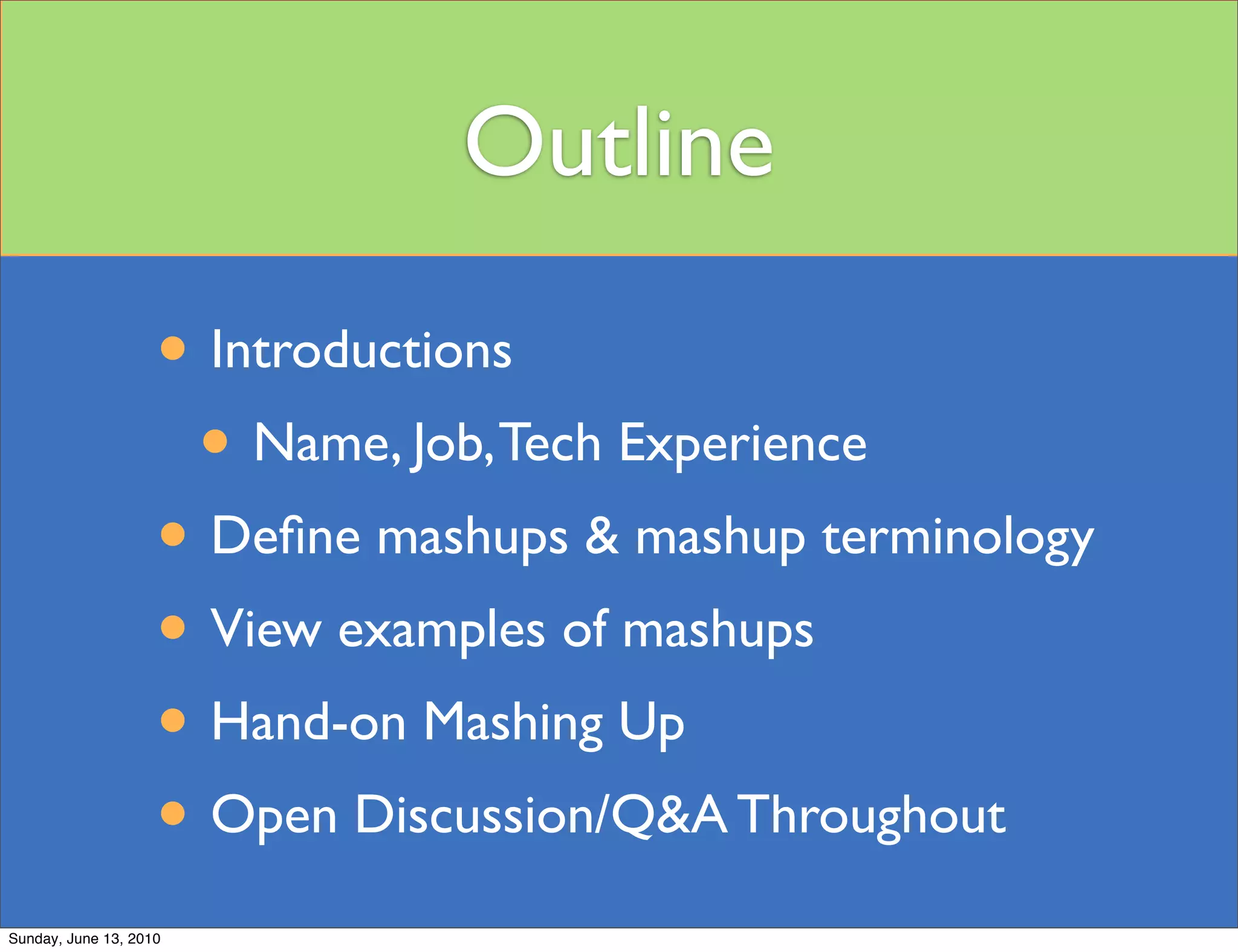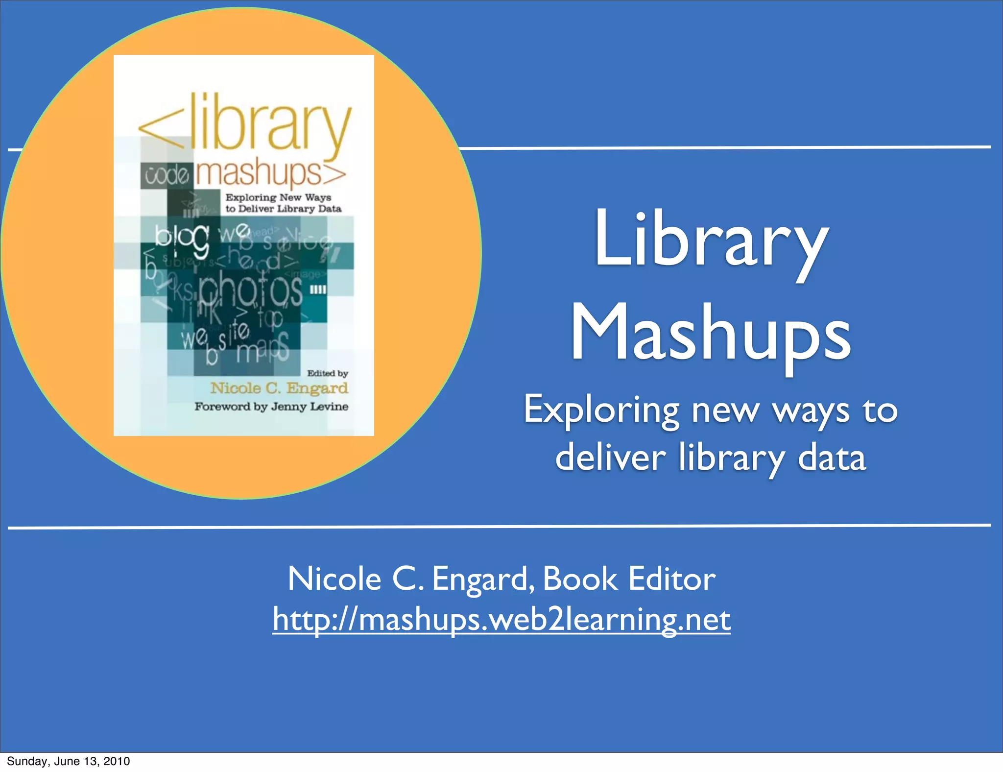 This document provides an outline for a presentation on library mashups. The presentation will introduce mashups and their terminology, provide examples of mashups, demonstrate hands-on mashing up using tools like Yahoo Pipes, and have an open discussion. It notes the accounts needed for hands-on exercises and discusses types of mashups and how they can benefit libraries. Potential library mashup ideas are presented, as well as tools for creating mashups.