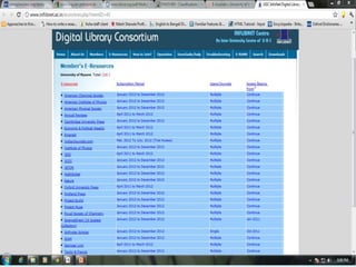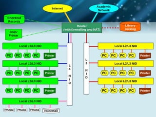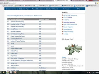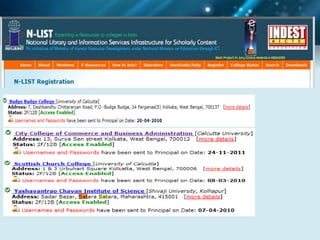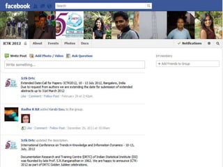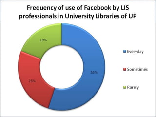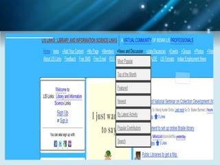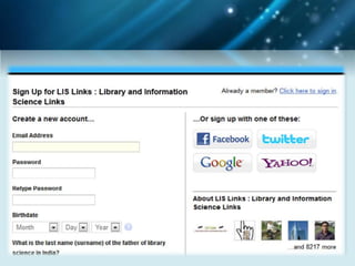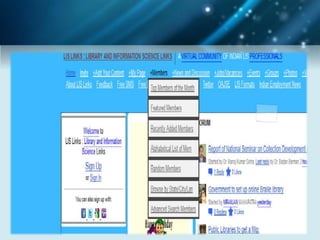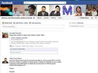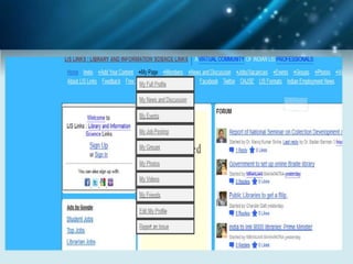 The document discusses using social networking components in library networks. It describes UGC-Infonet 2.0 and N-LIST programs which provide e-resources to universities and colleges. Social networking allows libraries to interact with patrons through sites like Facebook, providing information and services. Library professionals can use Facebook to promote their library's features, share information with users, and notify them of new items using Facebook notifications. This improves interaction between librarians and patrons.