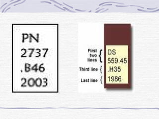 The Library of Congress Classification (LCC) system has evolved over time from simple size-based shelving to more complex classification schemes. In the late 19th century, a new Librarian and building prompted a reclassification using Thomas Jefferson's modified scheme. This evolved into the current LCC system, which builds upon other classification schemes like the Dewey Decimal Classification and Cutter's Expansive Classification. The LCC uses a mixed alphanumeric notation system and is favored for use in large research libraries due to its flexibility and ability to accommodate new subjects over time.