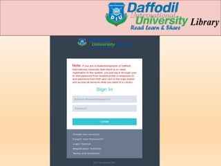 The document provides an overview of the Daffodil International University library's resources, including a total of 521,395 items such as printed books, e-books, e-journals, and various projects and publications. It outlines methods for finding printed books, accessing e-resources, remote access options, and guidelines on avoiding plagiarism. Additionally, it includes links to library websites and contact information for further assistance.
