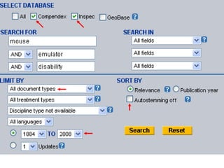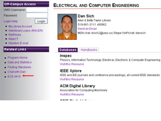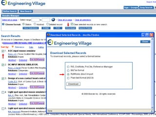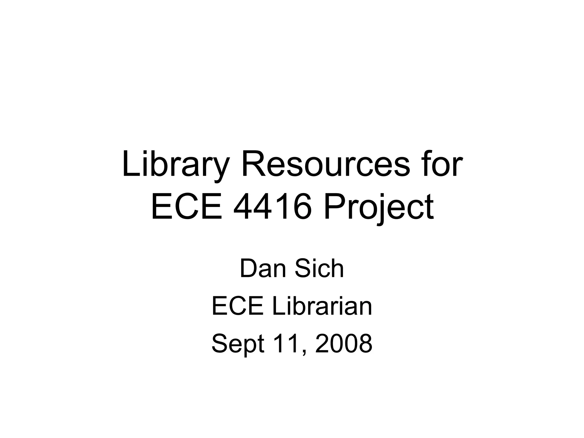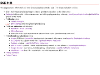 The document provides an overview of library resources for an ECE 4416 project. It discusses different sources of information like journals, books, standards, and patents. It also demonstrates how to search databases like Inspec and Compendex to find scholarly articles, export citations to RefWorks, create bibliographies, and get full text articles or locate print versions. Tips are provided on searching techniques and limitations of various resources.