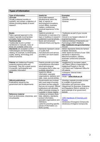 2. The types of information sources available, including journals, books, patents, and web resources.