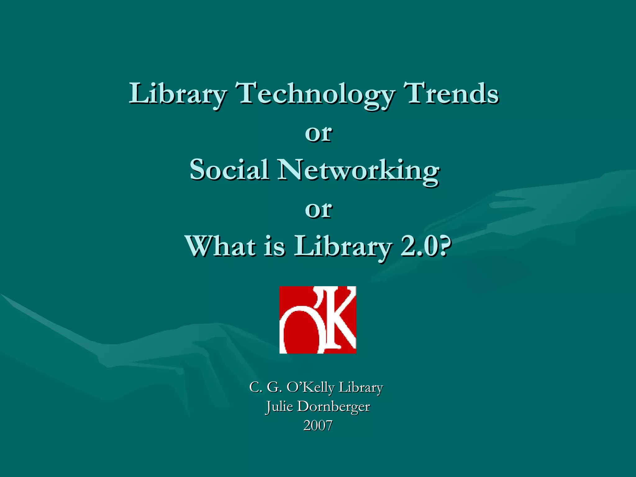 This document discusses RSS (Really Simple Syndication) and how libraries can use RSS feeds and readers. It provides examples of libraries that offer RSS feeds with information like new books, resources, and events. It also lists some free RSS readers like Google Reader and Bloglines that allow users to subscribe to these feeds in one place. Recommended RSS feeds from the Library of Congress, Library Journal, and other sources are included to help librarians learn more about using RSS in their libraries.