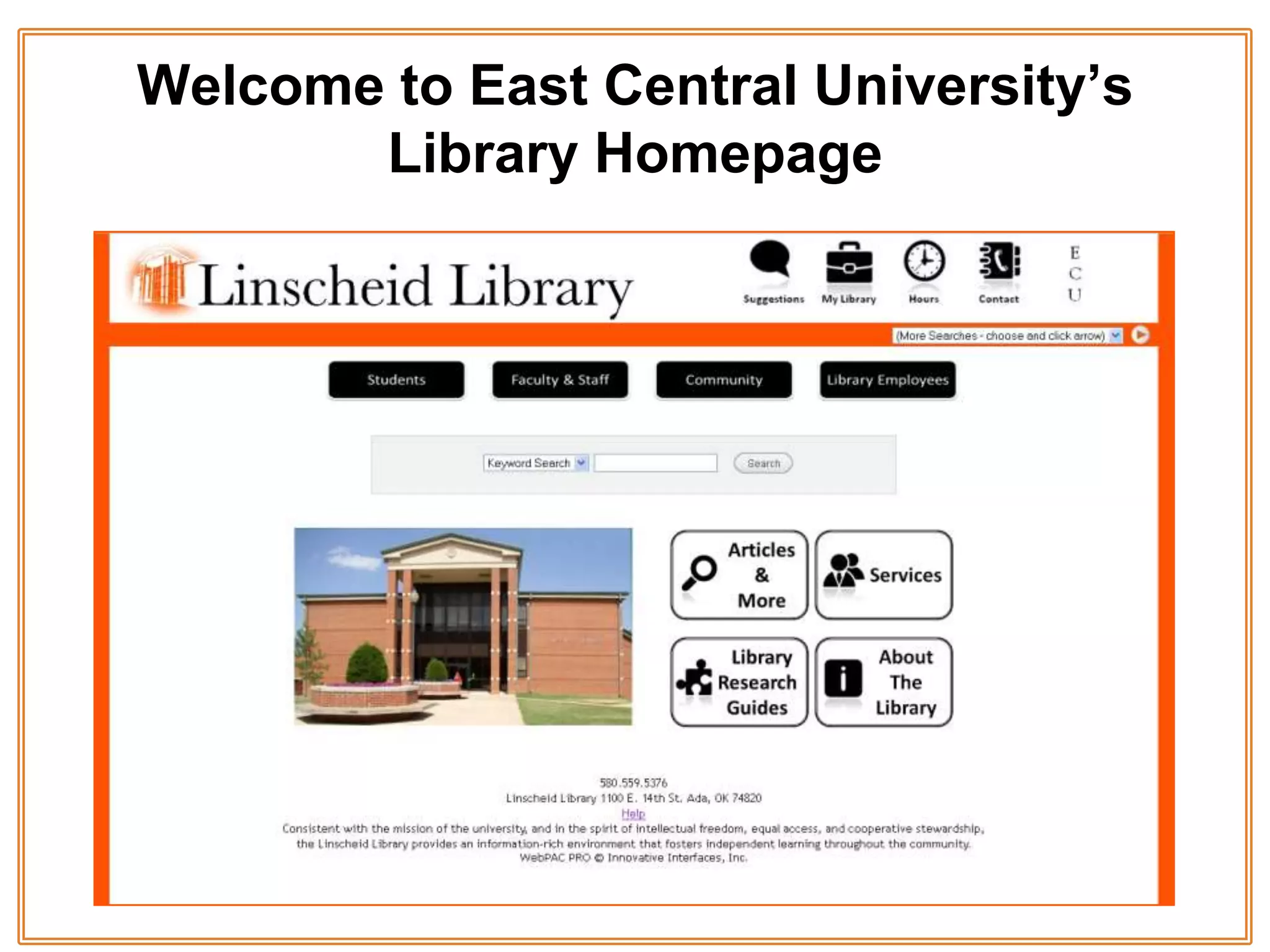 This tutorial provides an overview of the Linscheid Library homepage and its key features and resources for students. It explains that the homepage can be accessed from the East Central University website and highlights topical sections for students, faculty, online catalog searches, articles and databases, library services, research guides, general library information, and quick links. The tutorial is intended to help students navigate and familiarize themselves with the resources available on the library homepage.