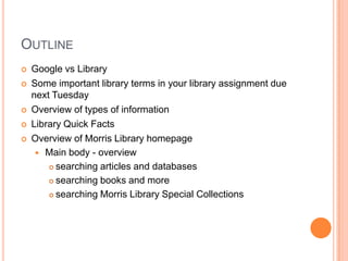 This document provides an outline for a library orientation for history students. It begins with an overview of important library terms and types of information. It then summarizes key sections and features of the Morris Library homepage, including searching for articles, books, and special collections. It also reviews collections like course reserves and government documents. The document concludes with highlighting help resources like research guides and contacting a librarian.