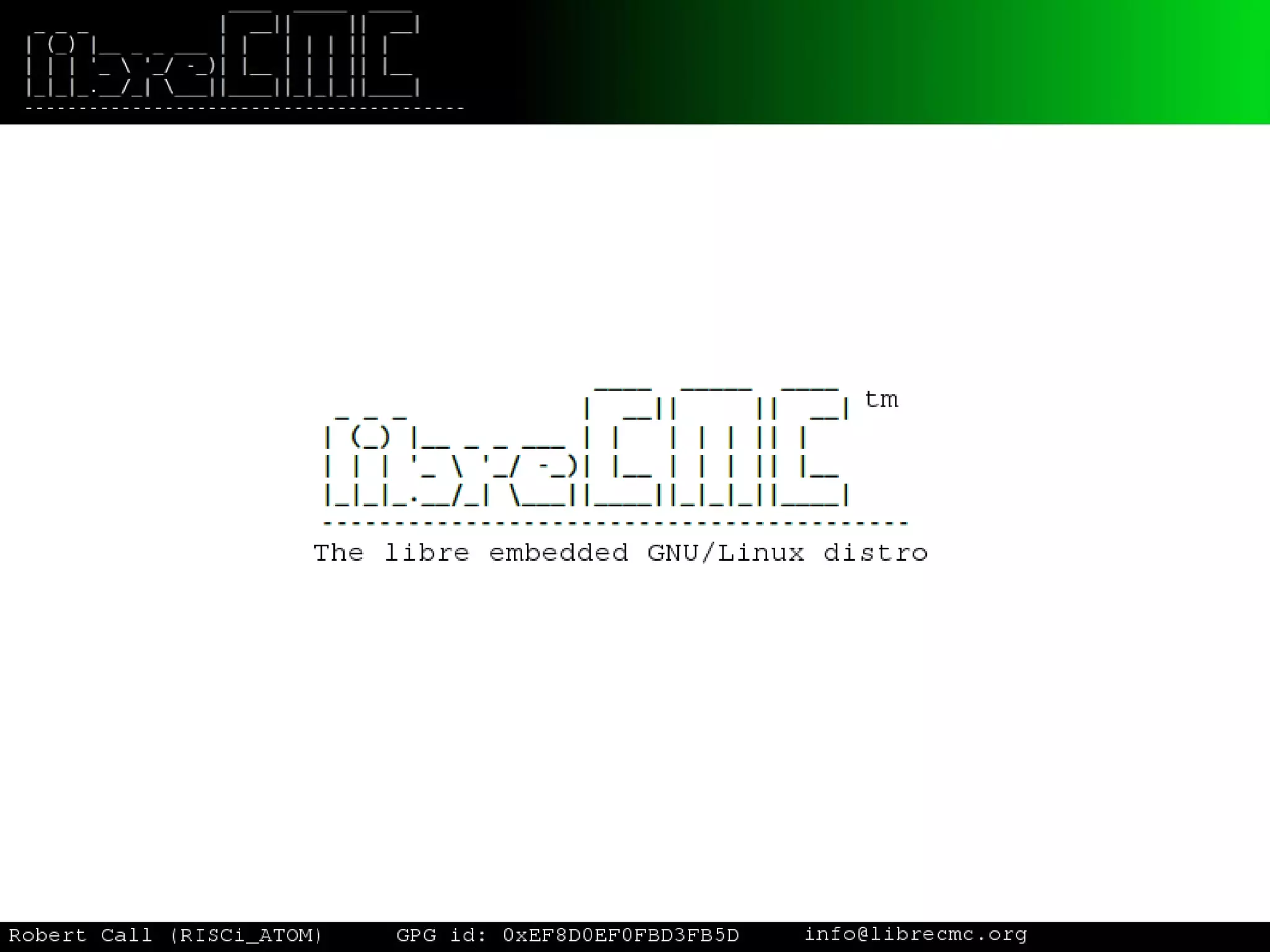 The document discusses the development of librecmc, a project aimed at creating a fully free software operating system for embedded devices, particularly routers. It highlights the challenges of using non-free components in the embedded realm and the project’s goals, which include providing long-term support for its software. Additionally, it emphasizes the need for a sustainable model that balances consumer-facing projects with research to ensure ongoing development and innovation.