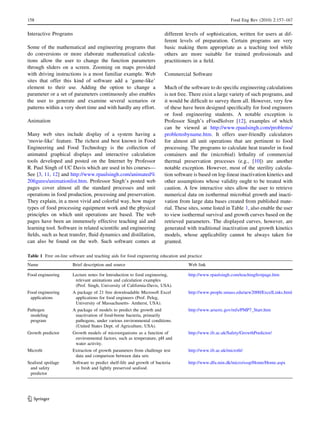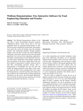 This document discusses interactive software demonstrations available through the Wolfram Demonstrations Project that can be used for food engineering education and applications. It provides examples of over 40 demonstrations developed specifically for food and food engineering topics. The demonstrations cover areas like mass balance, heat transfer, fluid flow, microbial kinetics, and particulate technology. They allow users to visually explore concepts and engineering calculations by interactively adjusting parameters and seeing results update in real-time. The demonstrations can be used as teaching tools or by professionals for routine engineering calculations.