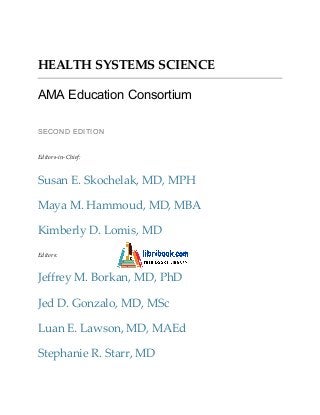 This document provides a table of contents for a textbook on Health Systems Science. The textbook contains 17 chapters covering topics such as systems thinking in healthcare, the healthcare delivery system, quality improvement, population health, health policy and economics, and the application of health systems science competencies. It also includes introductions, summaries, references and bibliographies for each chapter.