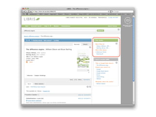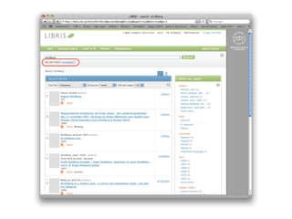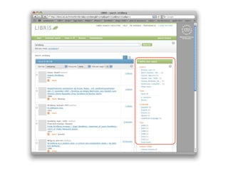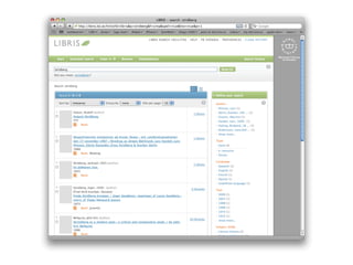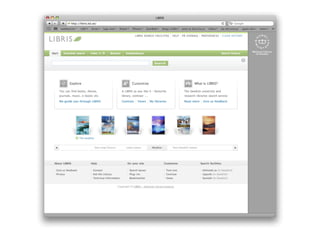 LIBRIS is the Swedish national library catalog and directory that has existed since 1970. It contains over 6 million bibliographic records and links data about 175 libraries. LIBRIS recently transitioned to providing data as Linked Open Data to better integrate with the web. By exposing bibliographic records and authority files as structured data with HTTP URIs and links to vocabularies, LIBRIS allows its data to be queried and used freely on the web rather than through isolated APIs. This transition positions LIBRIS to develop more links to external datasets and take advantage of the network effects of the semantic web.