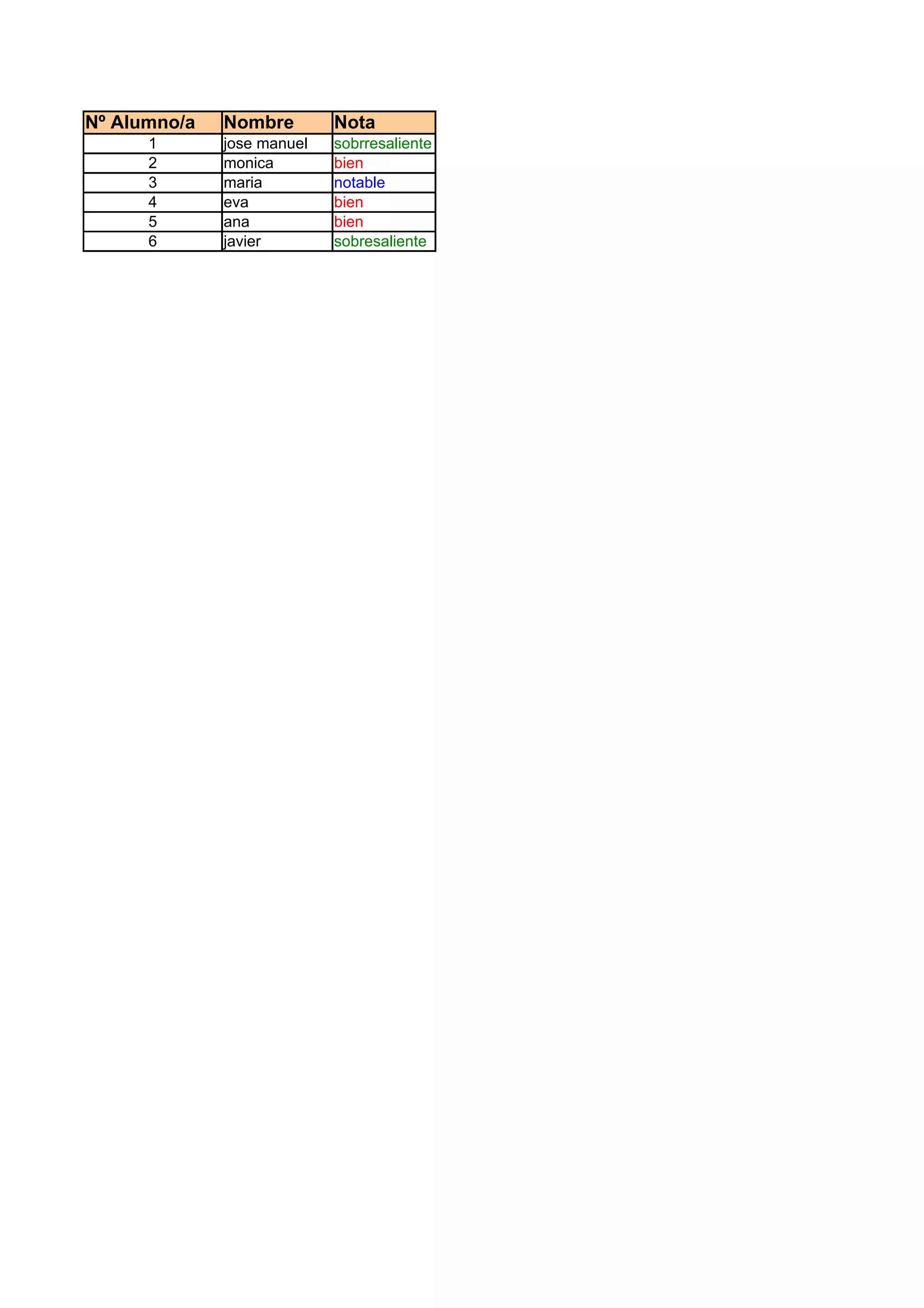 The document appears to be a student report card listing 6 students' names and their corresponding grades. It shows that students Jose Manuel and Javier received a grade of "sobresaliente", the highest grade, while students Monica, Eva, Ana received a grade of "bien" and Maria received a grade of "notable".
