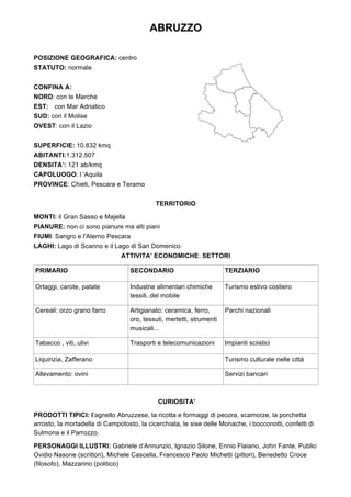 Il documento fornisce un'analisi dettagliata delle regioni italiane, elencando la loro posizione geografica, superficie, popolazione, attività economiche, prodotti tipici e personaggi illustri. Ogni regione ha un proprio capoluogo e viene descritta in termini di caratteristiche territoriali e risorse naturali. Inoltre, vengono menzionati i settori economici prevalenti che contribuiscono alla cultura e all'economia locale.