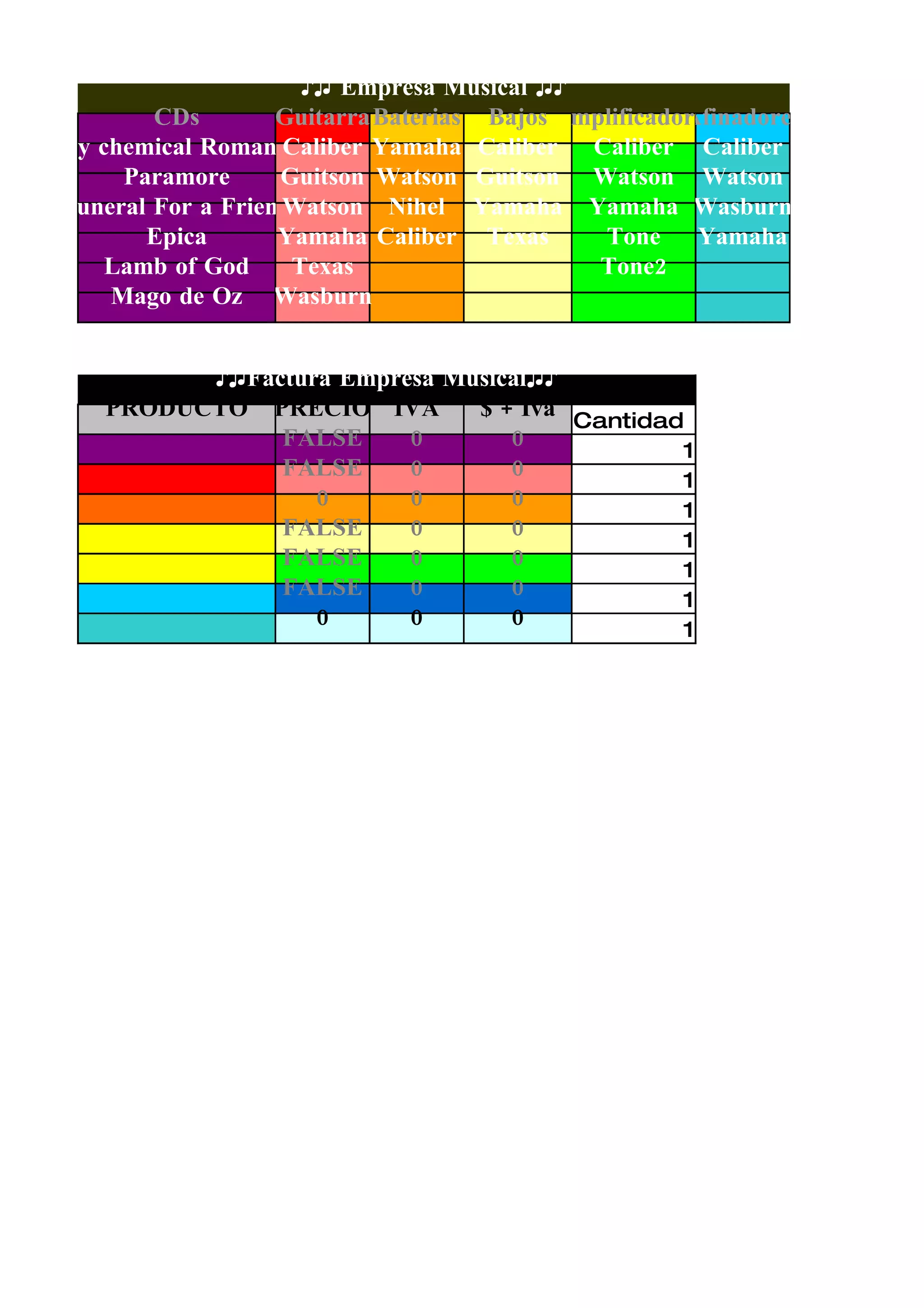 This document appears to be an inventory list for a music store that sells CDs, guitars, drums, basses, and amplifiers. It lists various artists and their CDs for sale, brands and models of instruments for sale, and a billing table with prices, taxes, and quantities for products purchased.
