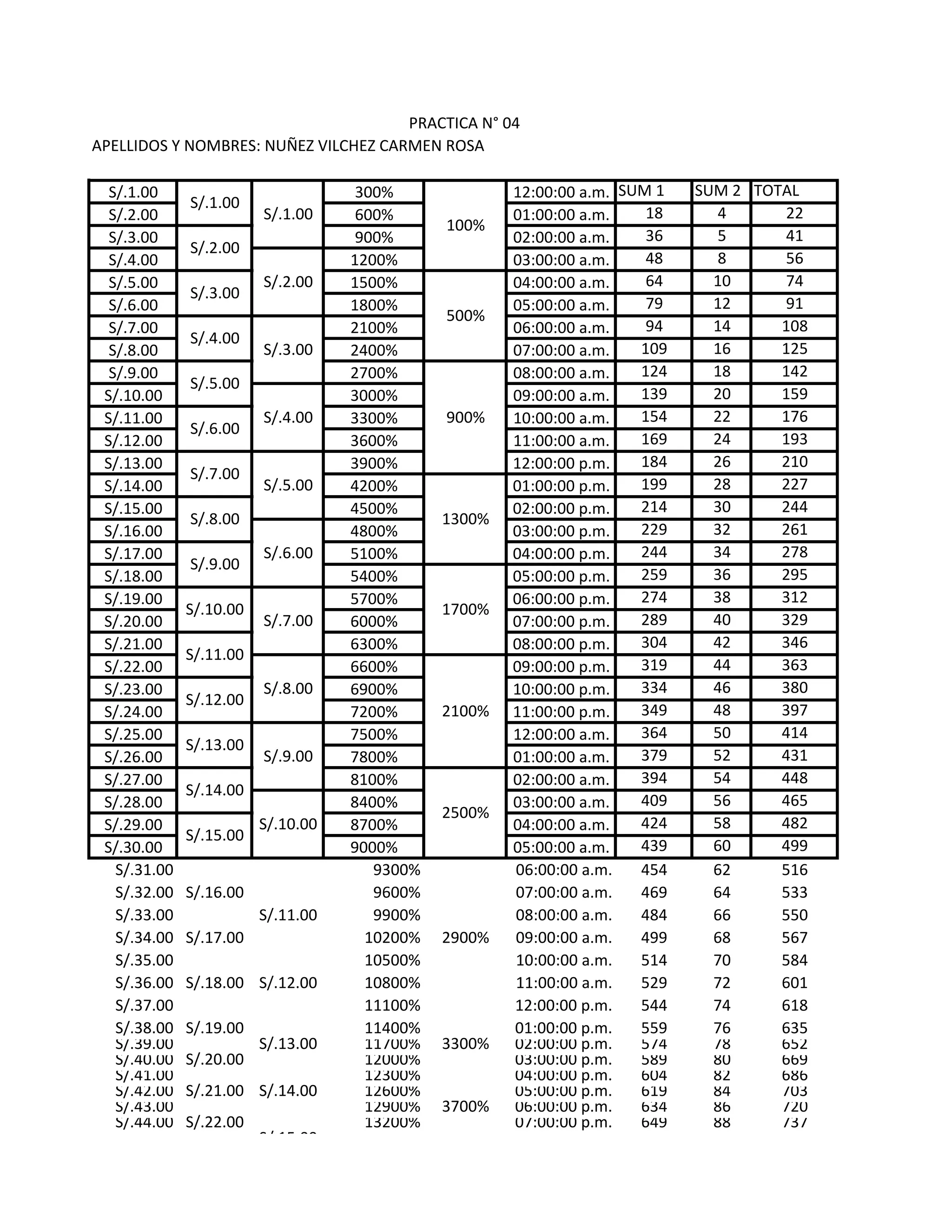 The document contains a table with information about money amounts ranging from S/.1 to S/.51 over time periods ranging from 12:00 a.m. to 02:00 a.m. For each time period, there are columns showing the money amount, interest rate percentage, and totals for sums 1 and 2. The interest rates fluctuate and occasionally have additional percentages added.