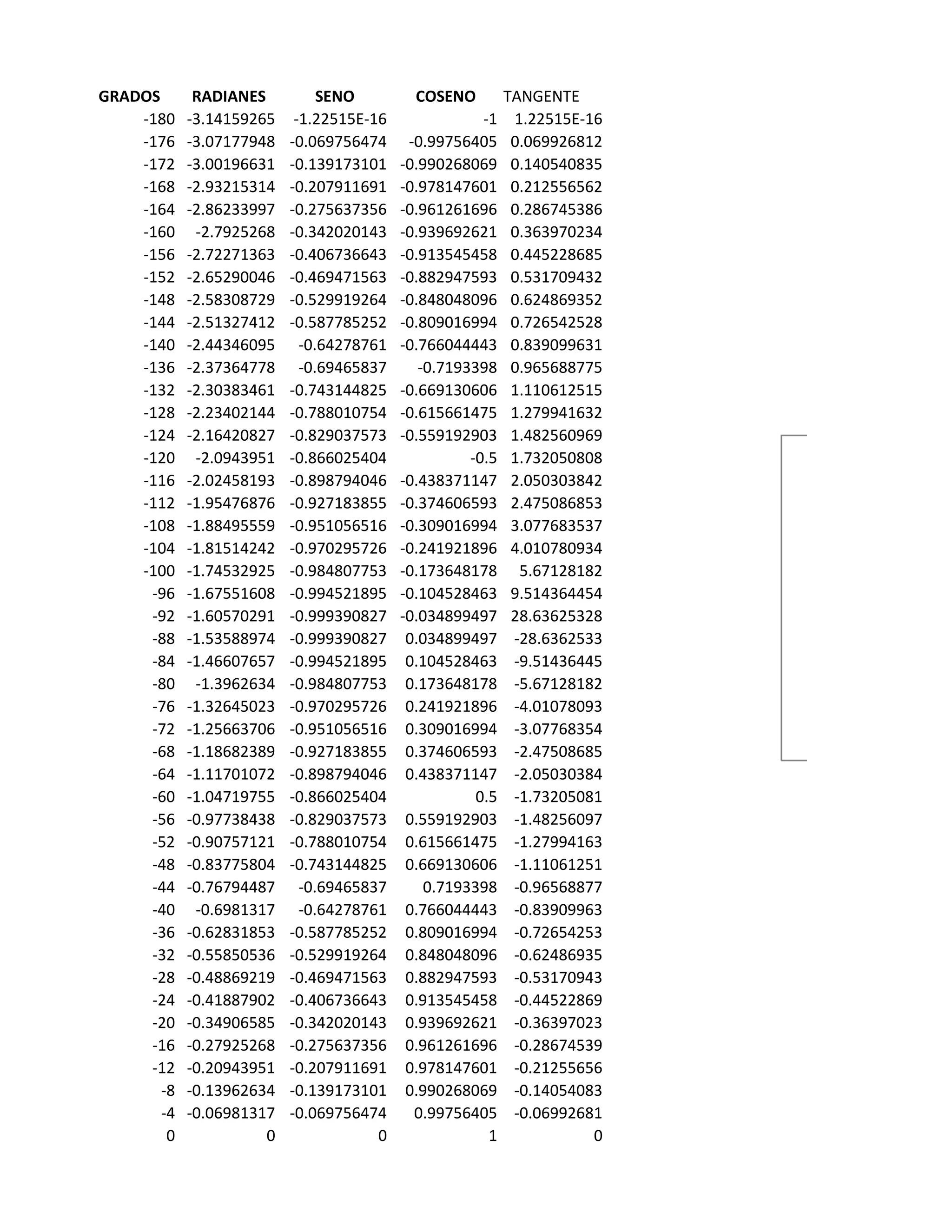 The document contains a table that lists angles in both grados and radians along with their corresponding sine, cosine, and tangent values. The table ranges from -180 to 180 degrees or -π to π radians in increments of 4 degrees/radians. It shows how the sine, cosine, and tangent values change as the angle increases, with sine and cosine values ranging from -1 to 1 and tangent values getting larger as the angle approaches π/2 radians.