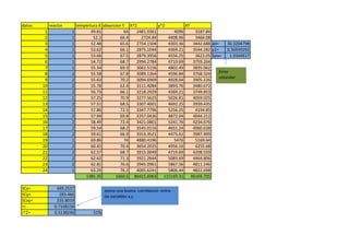 This document contains temperature and absorption data for multiple reactor measurements. It includes the variables X and Y, their squares, and their product XY. It then calculates the linear regression coefficients a0, a1, and Syx. It finds the standard correlation SCx, SCy, and SCxy and correlation coefficient r and r^2. It concludes that there is a good correlation between variables X and Y.