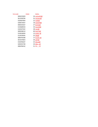 This document contains a list of 15 contacts that includes their name, last name, phone number, cell phone number, age, and email address.