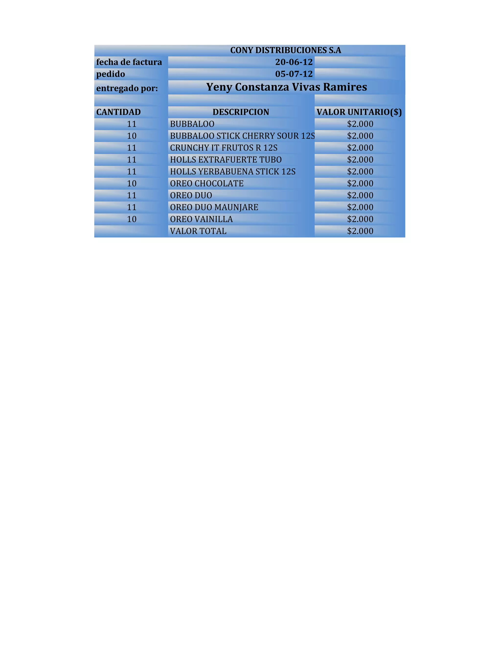 This document is an invoice from CONY DISTRIBUCIONES S.A dated June 20th, 2012 for an order placed on July 5th, 2012. It was delivered by Yeny Constanza Vivas Ramires and includes the quantities, descriptions, unit prices in Colombian pesos, subtotals and a total value of $191,296 for various snack foods including Bubbly, Crunchy IT, Holl's, and Oreo cookies.