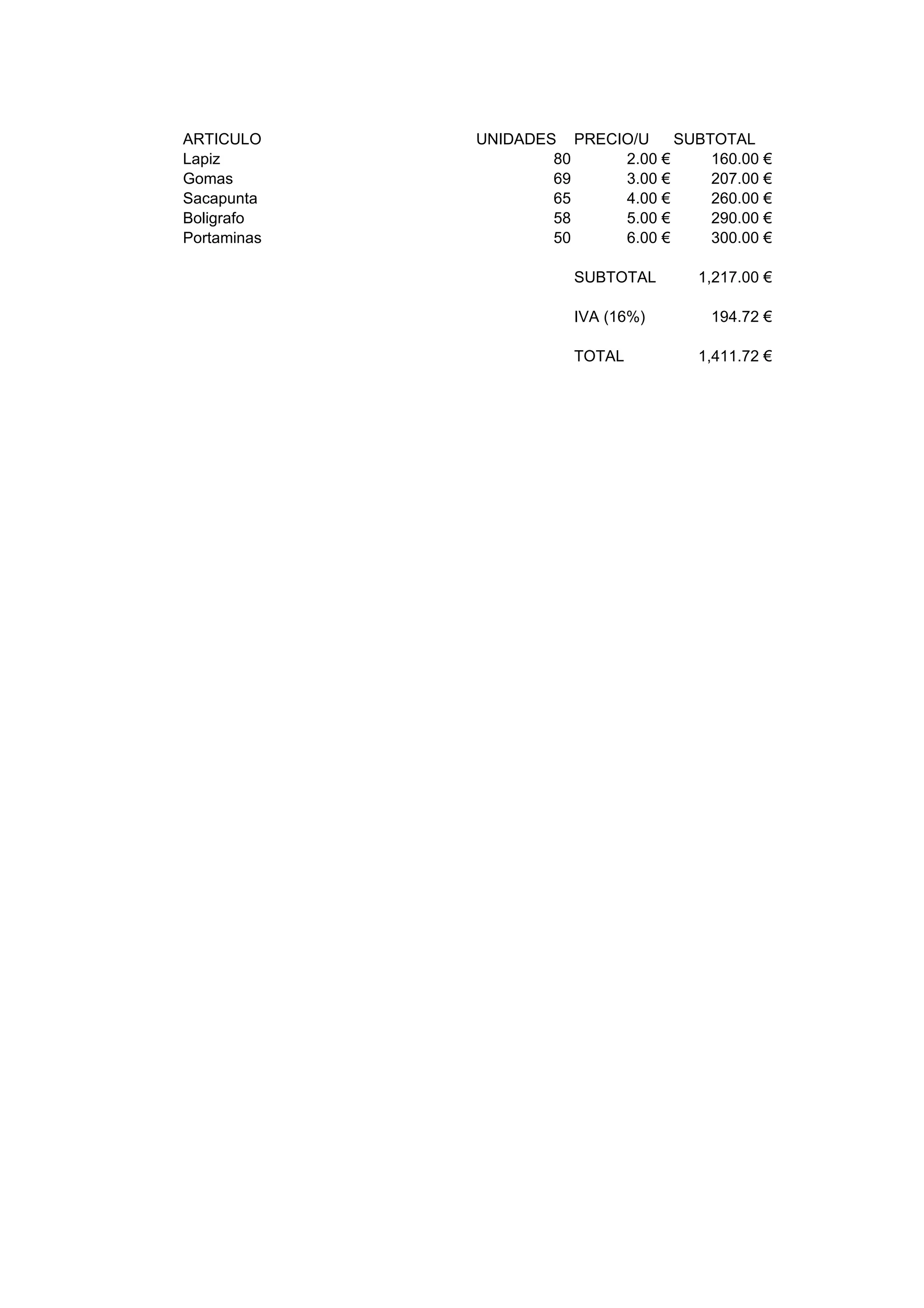 ARTICULO UNIDADES PRECIO/U SUBTOTAL