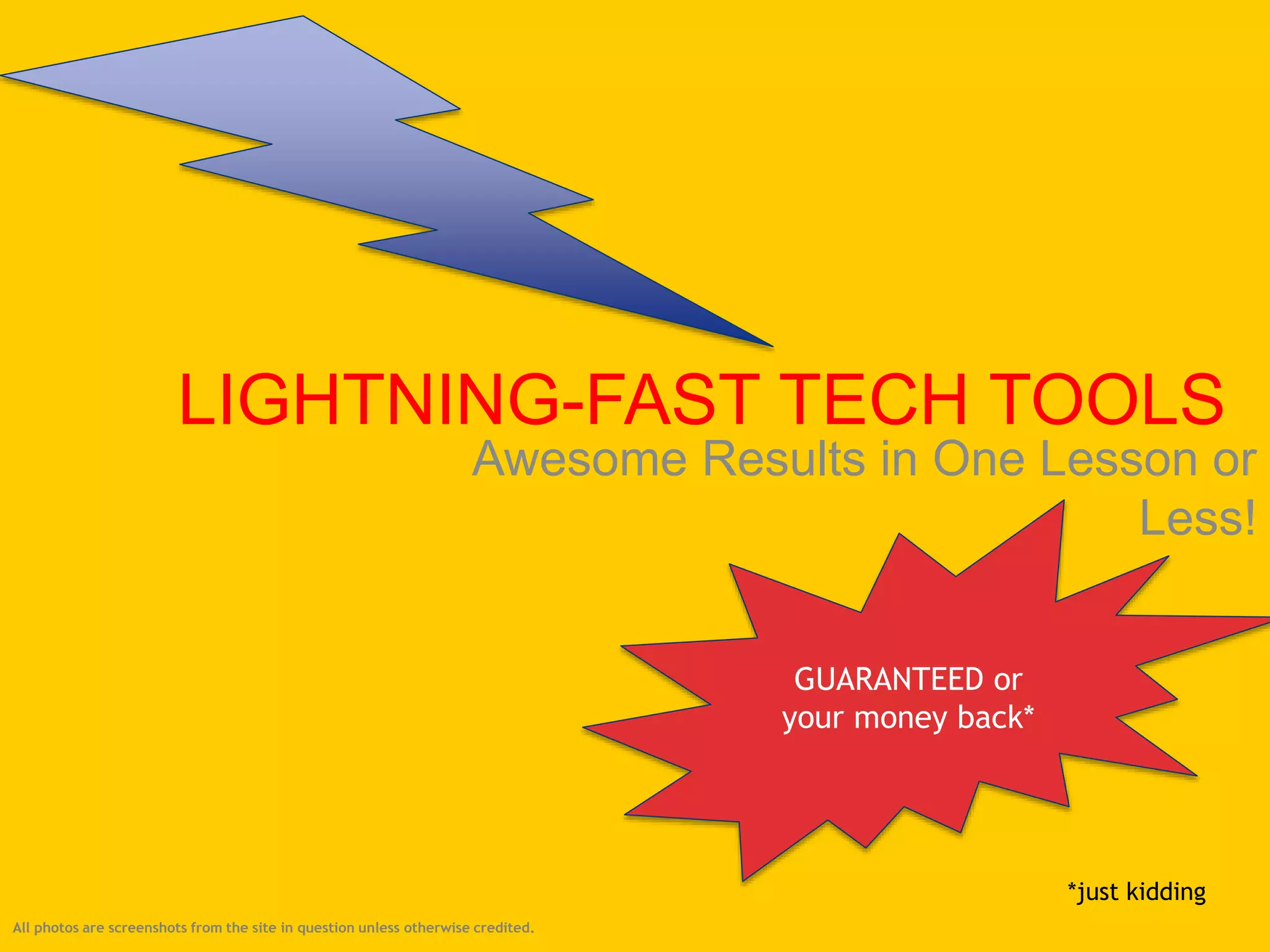 The document introduces six lightning-fast tech tools for creating presentations, videos, audio recordings, and storybooks. It provides a brief overview of each tool's features and capabilities. It also offers multiple ideas for using the tools in educational settings, such as creating slideshows about science topics with Haiku Deck or recording book reviews with Vocaroo. The tools are presented as quick and easy options for students to demonstrate their learning through creative projects.