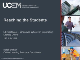 The document outlines the history and development of the University College of Estate Management, starting from its founding in 1919 and its transition to a fully online education model with over 4,000 international students. It highlights the challenges and opportunities in enhancing student and tutor engagement through innovative resources and training. The future plans include improving induction module design, utilizing e-library resources, and fostering better tutor-student relationships.