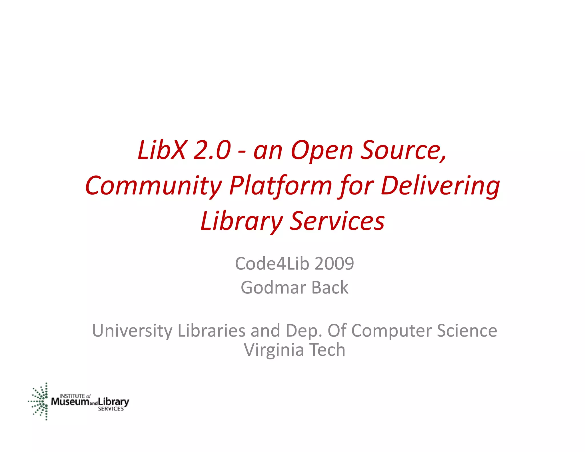 LibX 2.0 is an open source community platform for delivering library services. It provides a toolbar and configurable context menus that support functions like OpenURL, linking to library resources both on and off-campus. The LibX Edition Builder allows librarians to easily create and share customized versions of LibX for their institution. Emerging technologies provide opportunities to enhance LibX with features like web services, data mashups and social networking elements. The LibApp model defines a framework for modular components that can interact to enrich web content with library data and services.