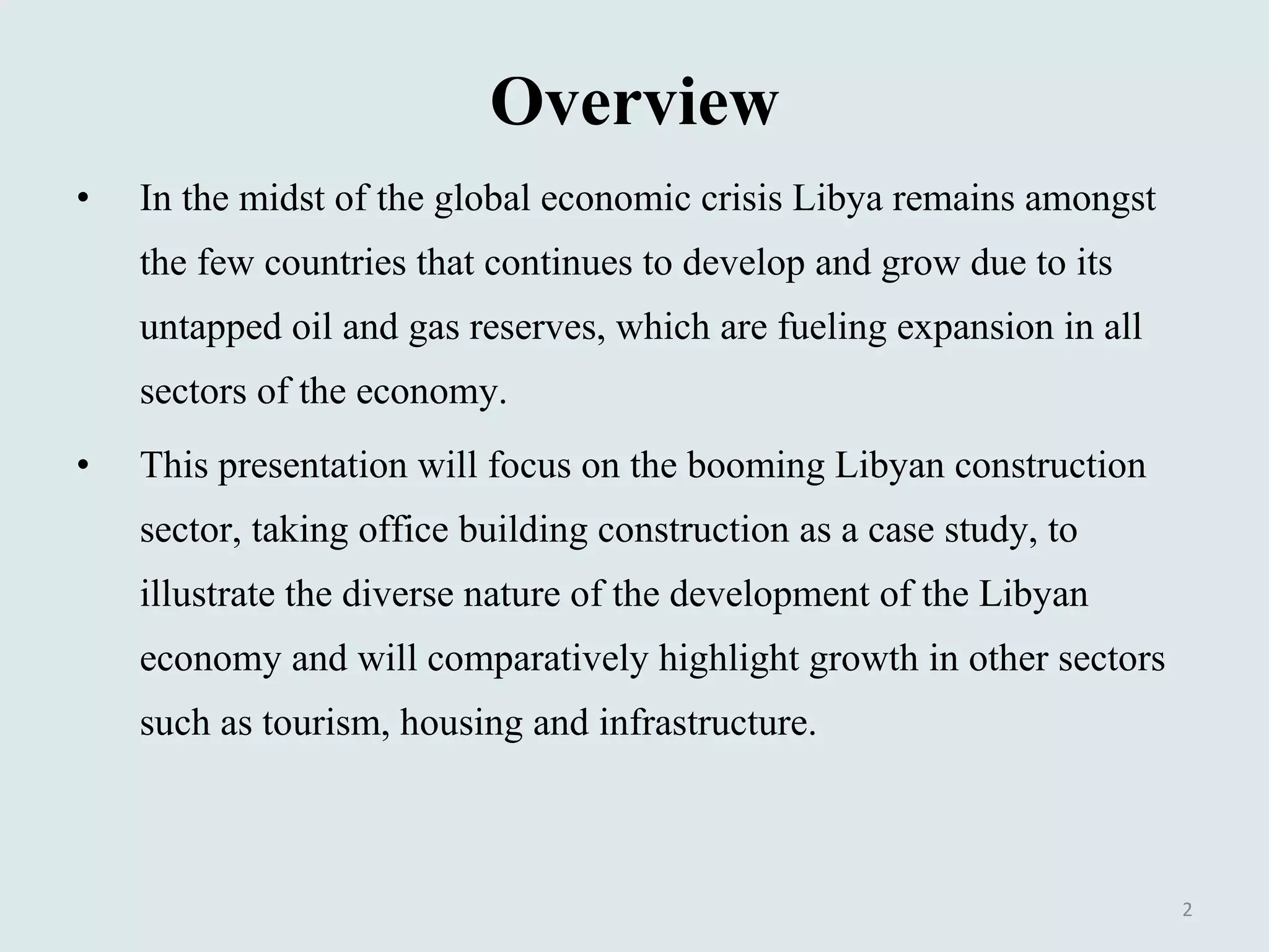 The document discusses Libya's growing construction sector, using the Burj Al Baher Complex office building project as a case study. It outlines Libya's strong economic growth fueled by oil and gas reserves. Several major office and mixed-use building projects are currently under construction or planning in Tripoli, including the Burj Al Baher Complex which will feature an office tower, hotel, and apartments totaling 27,000 square meters. The project overview provides details on the project components, location, financing, and construction progress.