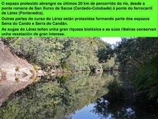 O espazo protexido abrangre os últimos 20 km de percorrido do río, desde a ponte romana de San Xurxo de Sacos (Cerdedo-Cotobade) á ponte do ferrocarril de Lérez (Pontevedra).