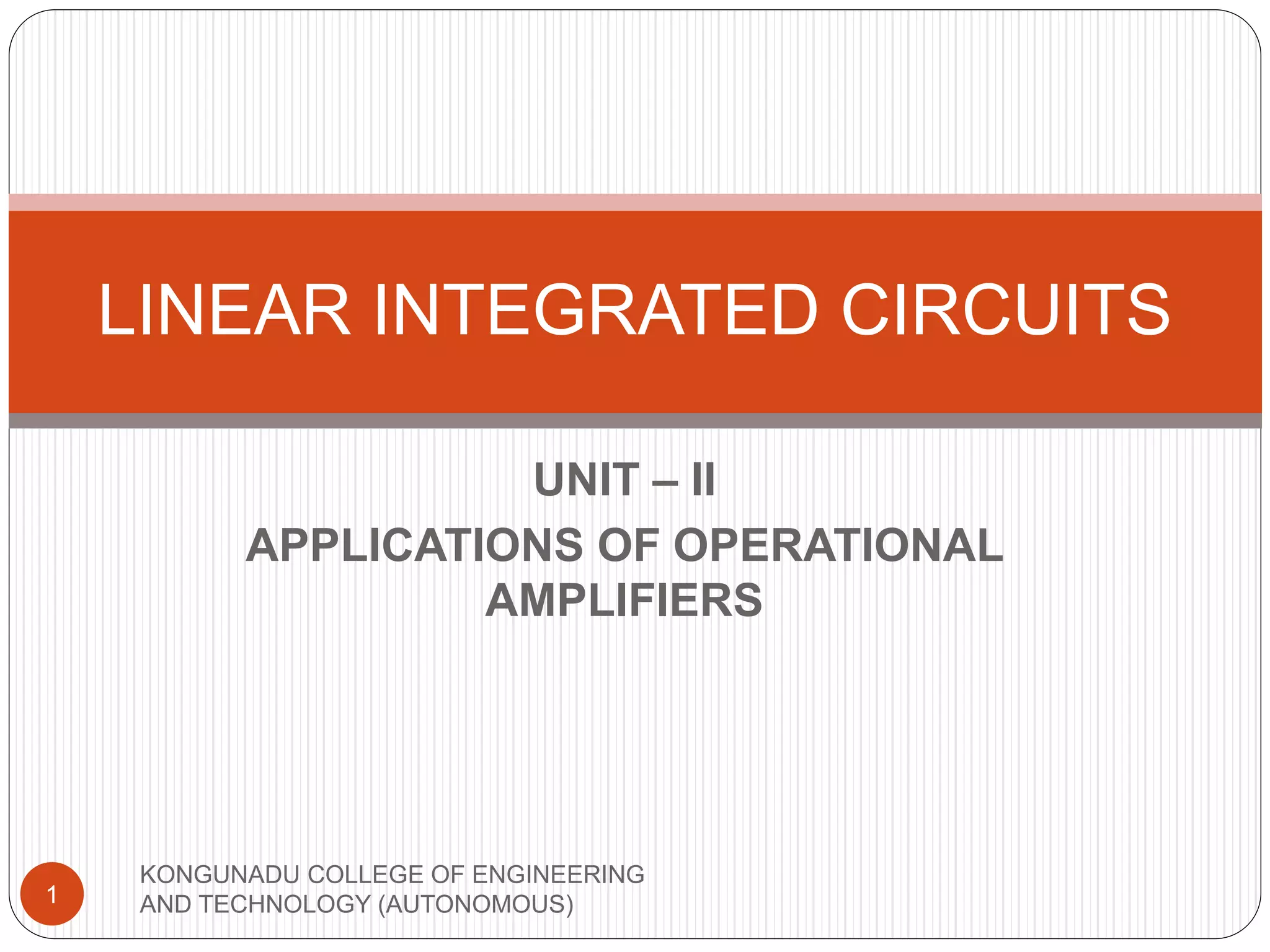 The document discusses various applications of operational amplifiers including scale changers, summing amplifiers, subtractors, instrumentation amplifiers, voltage to current and current to voltage converters, precision rectifiers, peak detectors, clippers, clampers, and filters. It provides circuit diagrams and explanations of how each application circuit works using operational amplifiers. The applications can be classified as linear applications like adders and non-linear applications like rectifiers.