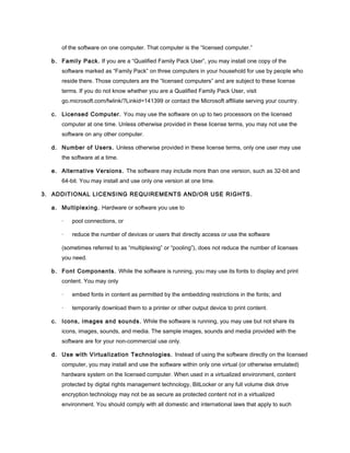 The document outlines the Microsoft Software License Terms for Windows 7 Home Premium Service Pack 1, detailing the rights and responsibilities of the user when installing and using the software. Key points include licensing rules, installation rights for personal and family use, and requirements for software activation and validation. It also explains the use of internet-based services and the consent for data transmission associated with these services.