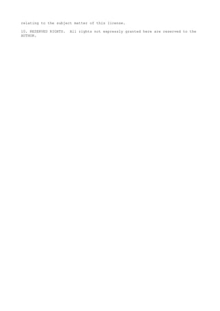 The document is a license agreement for the GSpot Codec Information Appliance software. It grants the user a non-exclusive, non-transferable license to use the software for personal or business purposes. The user does not receive ownership or title to the software. The author retains all intellectual property rights and the user cannot reverse engineer, modify, or distribute copies of the software without permission. The author provides the software "as is" and is not liable for any damages from its use.