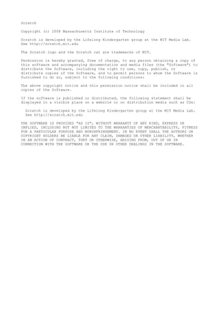 Scratch is a software developed by the Lifelong Kindergarten group at the MIT Media Lab to teach programming concepts. It is freely distributed under an open source license which allows copying and distribution with required copyright and warranty notices. The Scratch logo and cat are trademarks of MIT.