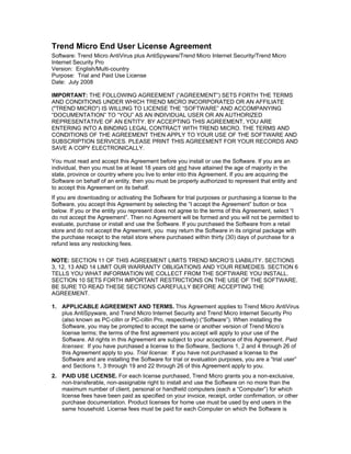 This document is Trend Micro's end user license agreement for their antivirus and internet security software. It outlines the terms for both trial and paid use licenses. For paid licenses, it grants the user rights to install the software on a limited number of devices. For trial licenses, it only allows installation on one device and expires after 30-90 days. It also details what subscription services and support users receive during the subscription term, how the software collects usage data, and various use restrictions.