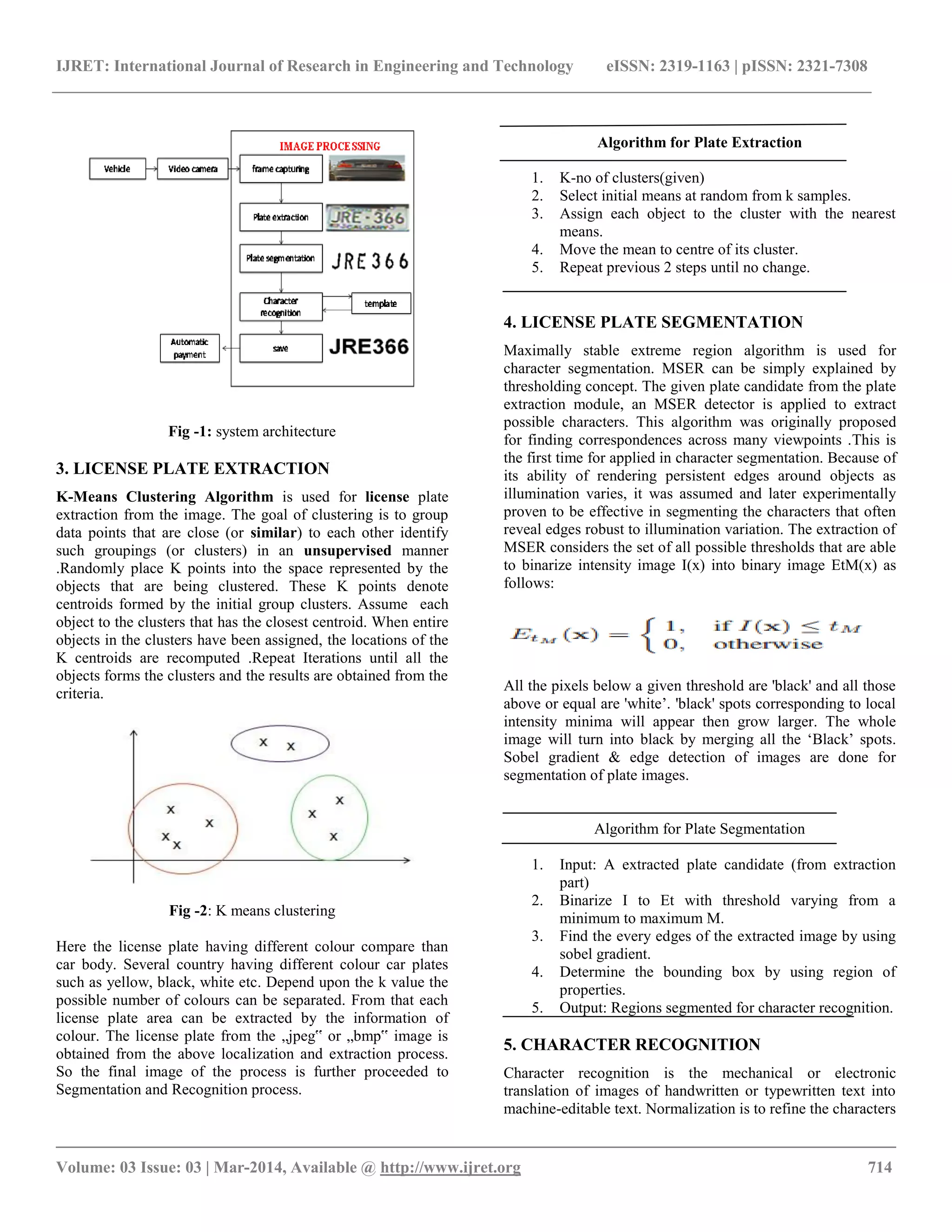 The document presents a system for automatic license plate recognition (ALPR) that facilitates toll payment applications by utilizing K-means clustering for license plate extraction, the Maximally Stable Extremal Region (MSER) for segmentation, and template matching for recognition. The integrated system captures video of vehicles at toll plazas, processes the images to identify license plates, and automates payment by deducting fees from owners’ accounts. Experimental results demonstrate the effectiveness of the developed algorithms across varying lighting conditions, suggesting the system's potential for practical deployment.