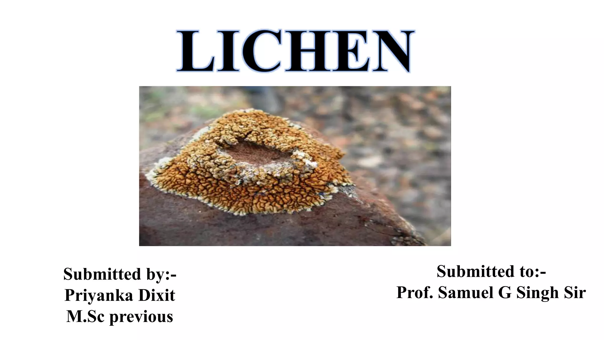 This document provides an overview of lichens. It begins with definitions, describing lichens as a symbiotic association between fungi and algae or cyanobacteria. It then covers the history of lichen research, habitats of lichens, ways of classifying lichens, their structure and reproduction methods. The document discusses lichens' economic importance, including as a food source, in medicine, dye production, and their use as bioindicators of environmental pollution. It concludes with an explanation of lichenometry, which uses lichen growth rates to determine the age of exposed rocks.