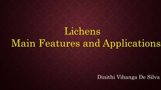 Lichens are symbiotic organisms formed by a fungus and a photosynthetic partner, typically algae or cyanobacteria, allowing them to thrive in various environments. They have several applications, including being used in perfumes, as natural dyes, in medicine for their antimicrobial properties, and as indicators of air quality. The document highlights the structure, types, features, and extensive uses of lichens as well as their historical significance in human food and culture.
