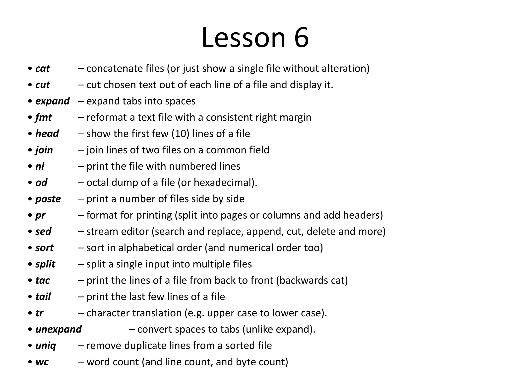 This document provides summaries of Linux commands that can be used to select and manipulate parts of files. It discusses the cat, head, tail, cut, split, sort, tac, uniq, and tr commands. Cat concatenates or displays files, head displays the first few lines of a file, and tail displays the last few lines. Cut extracts columns from a file, split divides a file into smaller parts, and sort sorts lines alphabetically or numerically. Tac displays the lines of a file in reverse order and uniq removes duplicate lines from a sorted file. Tr translates characters within a file, such as converting uppercase to lowercase.
